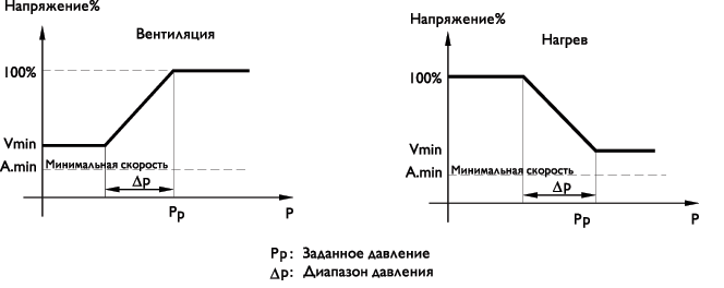 Регулирование скорости электродвигателей осуществляется автоматически с помощью аналогового сигнала (0-10 В, 4-20 мА) от преобразователя давления. Потенциометром устанавливается требуемое значение давления (по шкале потенциометра пропорционально диапазону работы преобразователя). Для его поддержания введена зона пропорционального изменения скорости двигателя по давлению, равная от 1 до 4 делений потенциометра преобразователя давления (потенциометр внутри корпуса). Выходное напряжение изменяется плавно в зависимости от величины сигнала управления от минимального до номинально значения в соответствии с заданным значением в диапазоне работы преобразователя и установленной зоны пропорциональности.